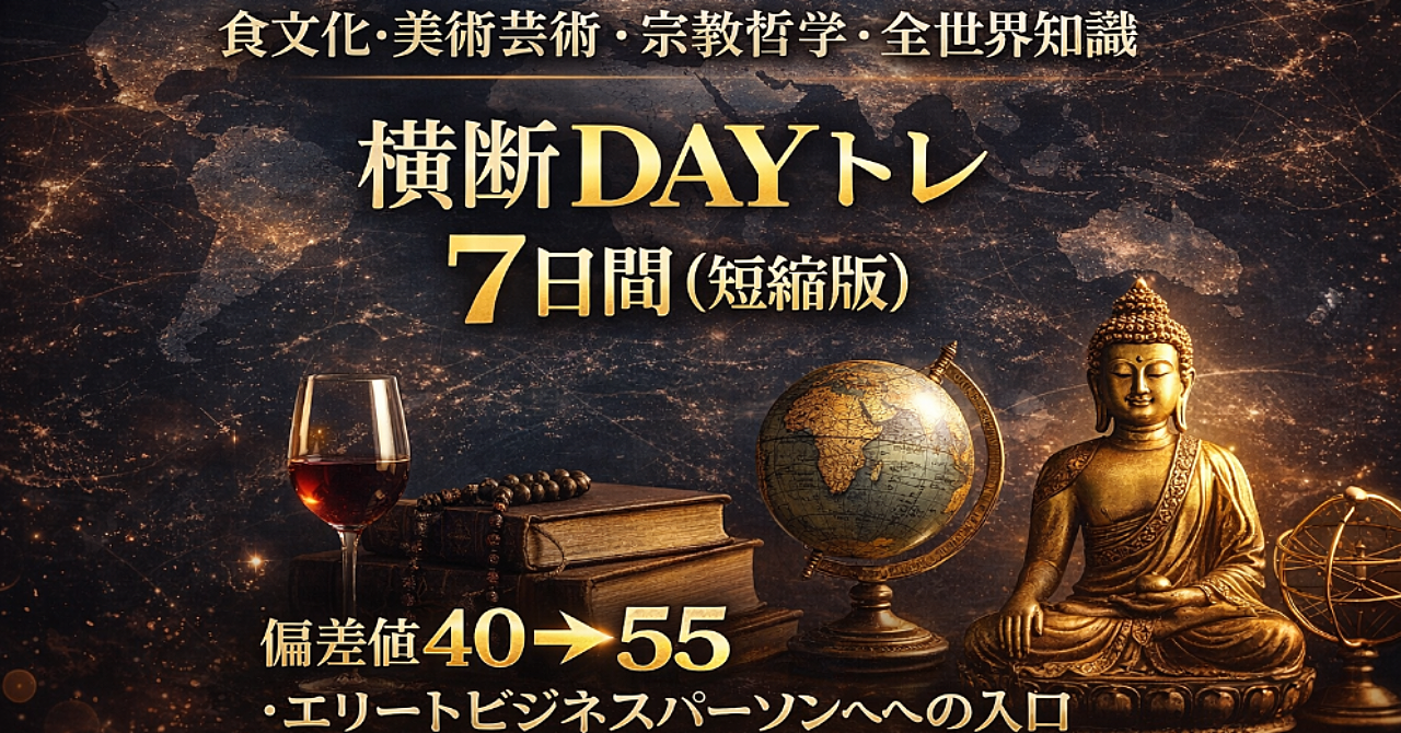 食文化・美術芸術・宗教哲学・全世界知識 横断DAYトレ 7日間(短縮版) 〜偏差値40→55・エリートビジネスパーソンへの入口〜
