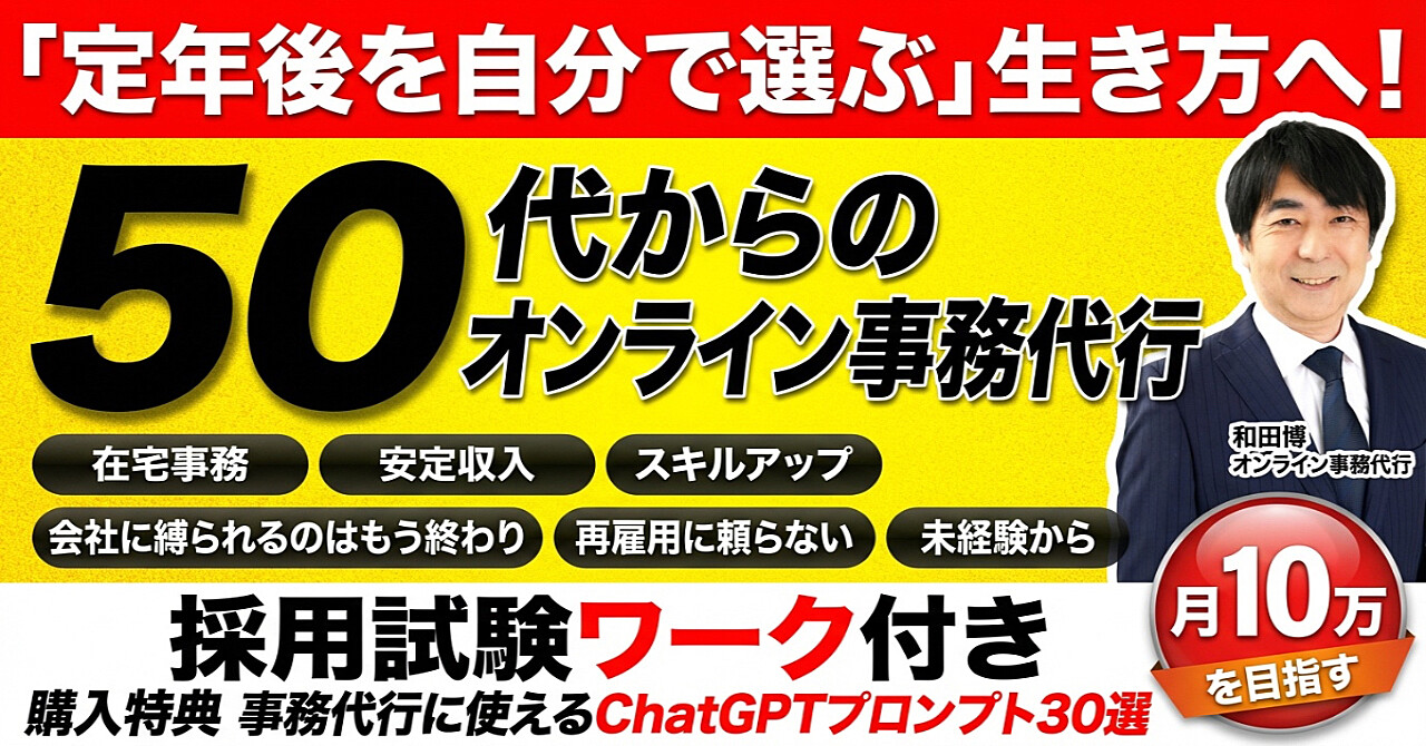 会社に縛られるのはもう終わり「定年後を自分で選ぶ」生き方へ! 50代からのオンライン事務代行:未経験から月10万をめざす【採用試験ワーク付き】