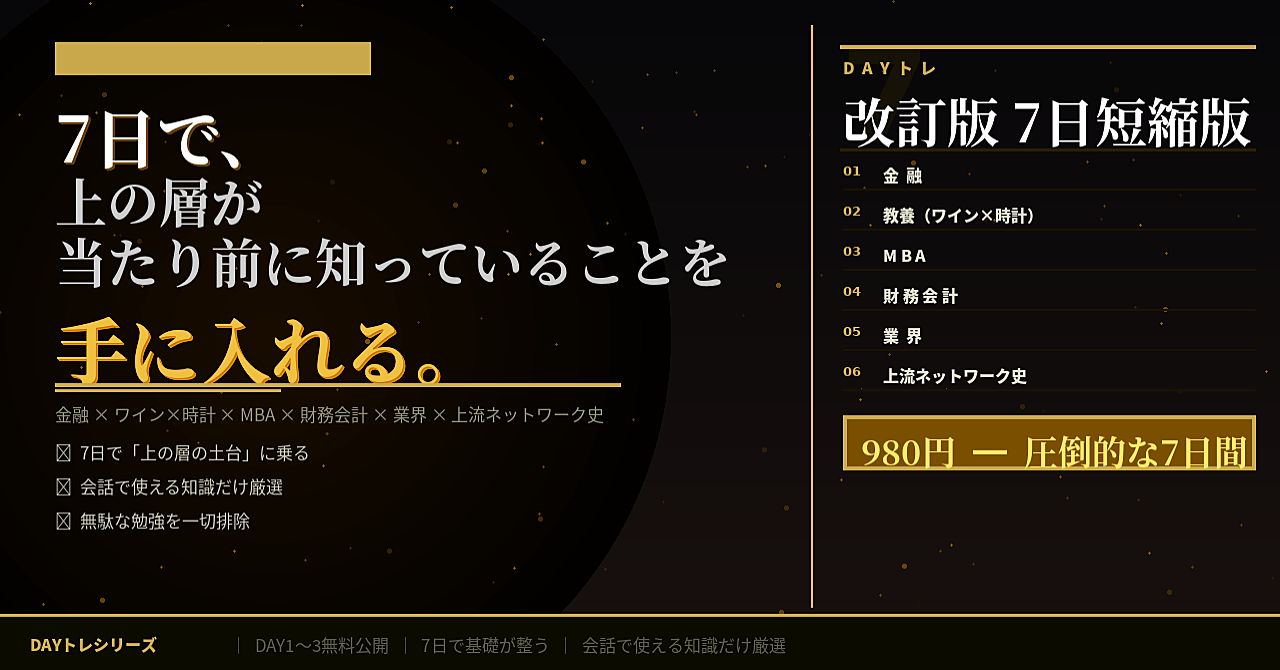 DAYトレ 7日短縮版(改訂版) 〜金融・教養(ワイン×時計)・MBA・財務会計・業界・上流ネットワーク史〜