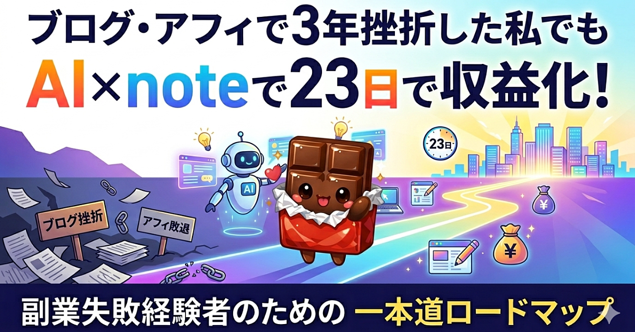 ブログ・アフィで3年挫折した私でもAI×noteで23日で収益化。副業失敗経験者のための一本道ロードマップ|始め方|使い方|初心者|AI初心者