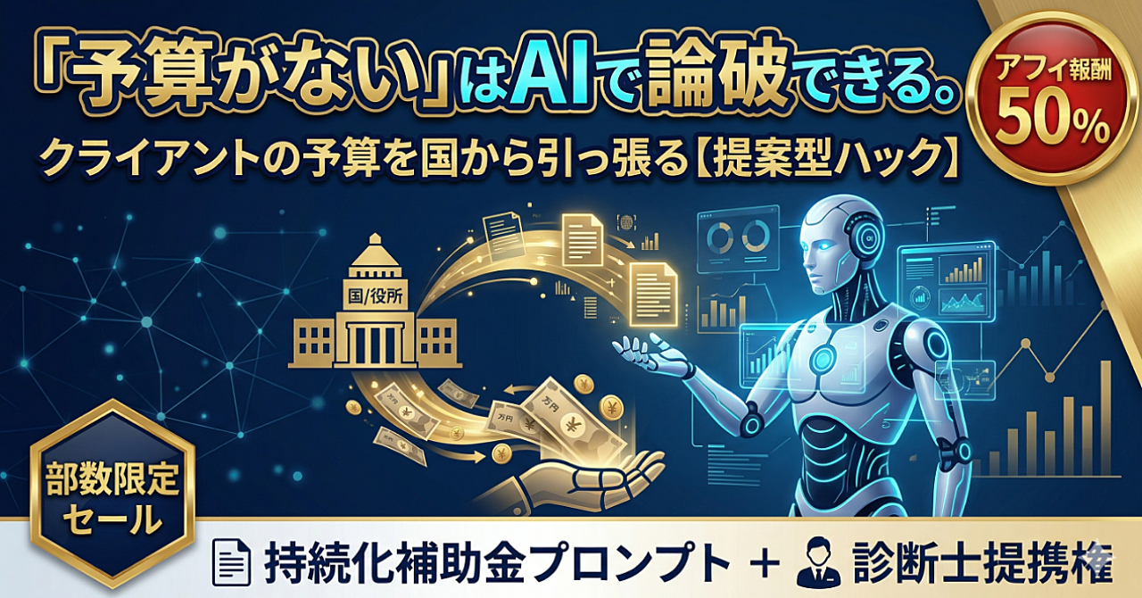 【営業不要で単価UP】「予算がない」を国から引っ張る!持続化補助金・提案用AIプロンプト&申請丸投げ権【中小企業診断士監修】(アフィ報酬50%)