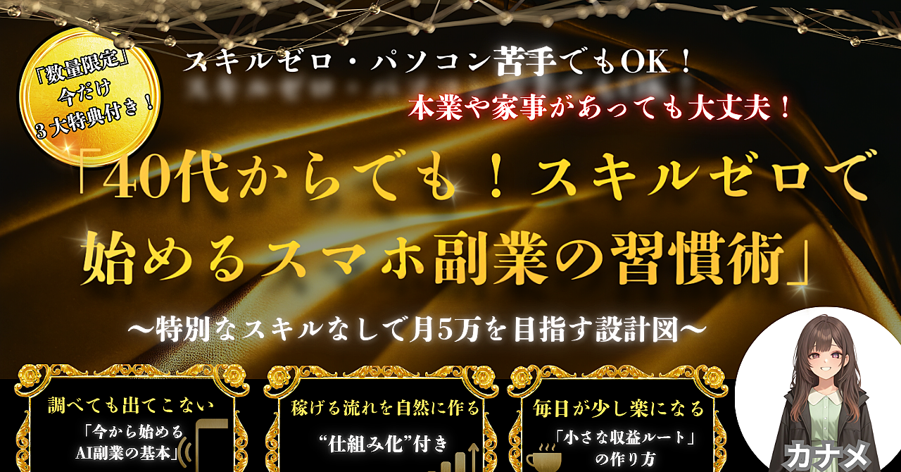 3大特典付き!【40代からでも!スキルゼロで始めるスマホ副業の習慣術】 〜特別なスキルなしで月5万を目指す設計図〜