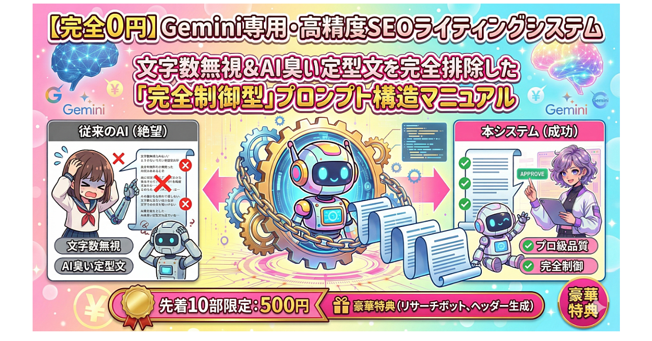 【無料Gemini完結】高精度SEOライティングシステム|文字数無視&AI臭い定型文を完全排除した「完全制御型」プロンプト構造マニュアル