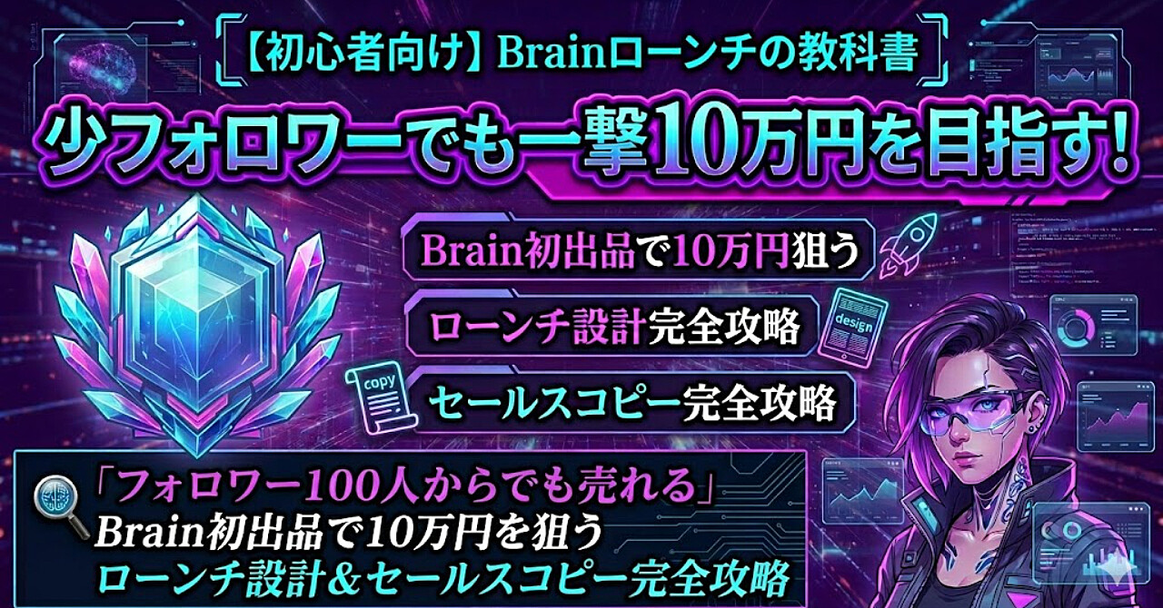少フォロワーでも一撃10万円を目指す!初心者向けBrainローンチの教科書 →「フォロワー100人からでも売れる」Brain初出品で10万円を狙うローンチ設計&セールスコピー完全攻略