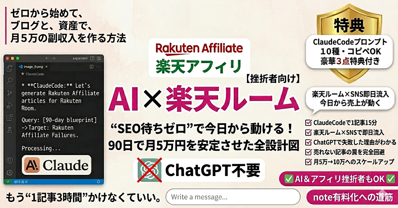 【楽天アフィリ挫折者向け】ClaudeCode×楽天ルームで90日以内に月5万円を安定させた全設計図|ChatGPT不要・SEO待ちゼロで今日から動ける
