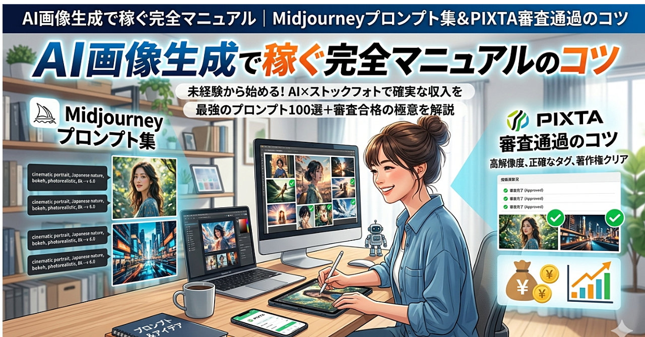AI画像生成で稼ぐ完全マニュアル|Midjourneyプロンプト集&PIXTA審査通過のコツ