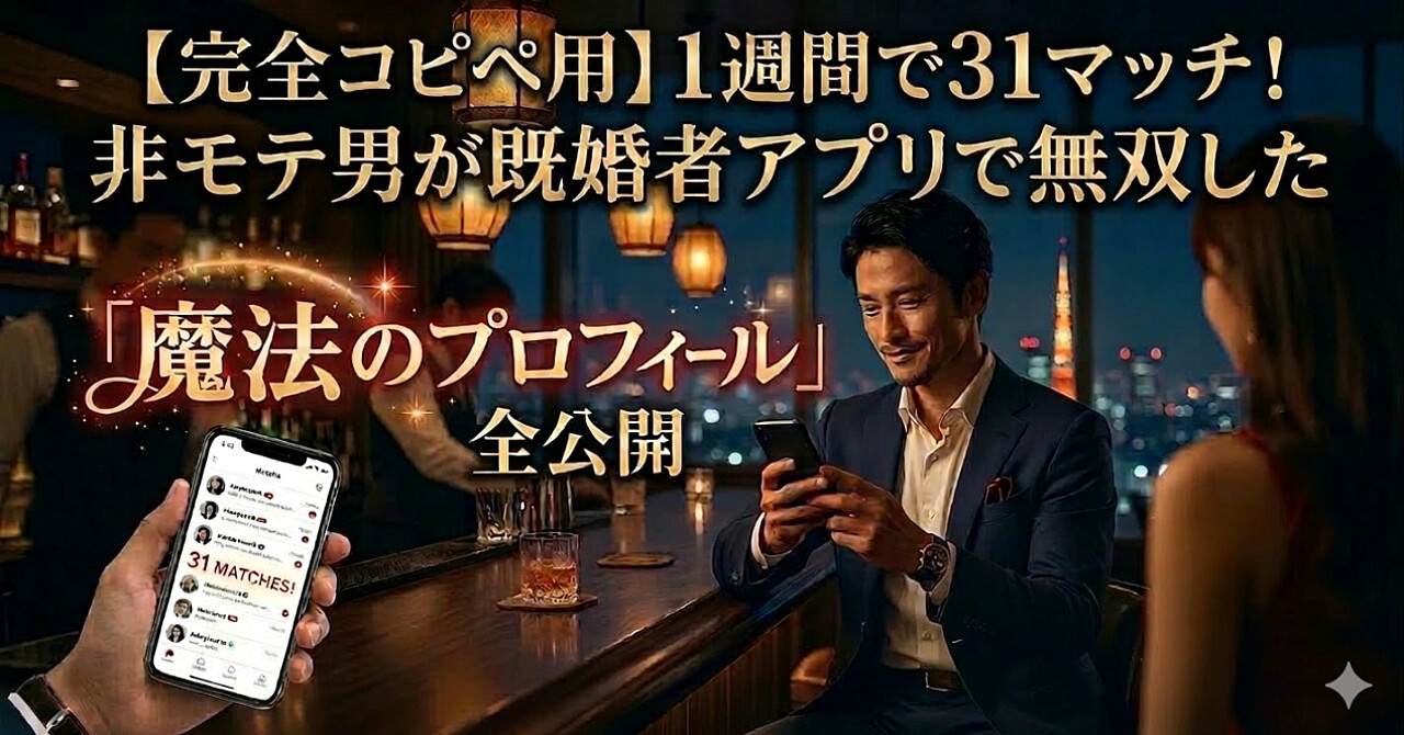 【完全コピペ用】地方で1週間31マッチ!非モテ男が既婚者アプリを無双した「魔法のプロフィール」全公開【返金保証あり】